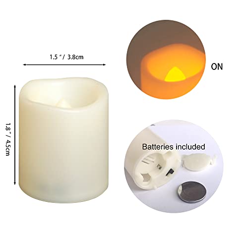 - مقاس واقعي ومثالي. سواء كان مظهر الشمعة البلاستيكية أو الضوء الوامض المتوهج الناعم واقعيًا. تبدو هذه الشموع النذرية عديمة اللهب وكأنها تومض مثل الشموع الحقيقية. يبلغ قطر كل شمعة نذرية 1.5 انش وارتفاعها 1.8 انش. يناسب المقاس معظم حاملات النذرية وحوامل ضوء الشاي وحوامل الزجاج وبرطمانات الماسون والحقائب المضيئة واليقطين للهالوين.