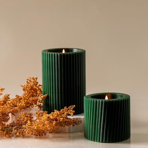 Candle Connection - شمعة دائرية مموجة غير معطرة من كاندل كونكشن بقطر 10 سم × ارتفاع 10 سم، أخضر غامق