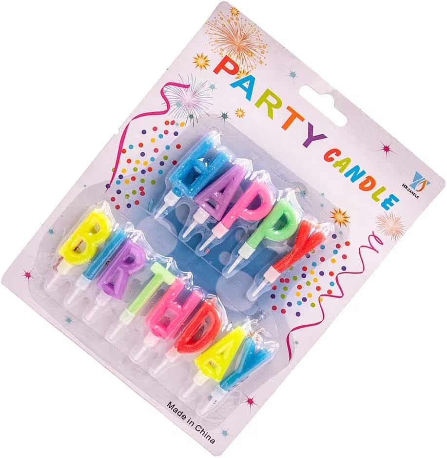 - شموع عيد ميلاد سعيد: مجموعة كاملة من شموع الحروف متعددة الألوان تكتب "Happy Birthday" لكعكتك.