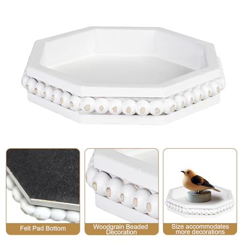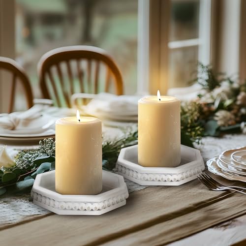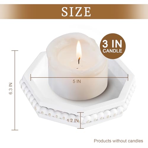 CEDARLUX - قاعدة شموع للشموع العمودية من قطعتين، صينية حمل خشبية مستديرة بنمط ريفي مطرزة، صينية خشبية مزينة بخرز لحمل الشموع بنمط المنزل الريفي والمزرعة، ديكور عرض الأكواب، قطعة مركزية للطاولة، لون أبيض عتيق