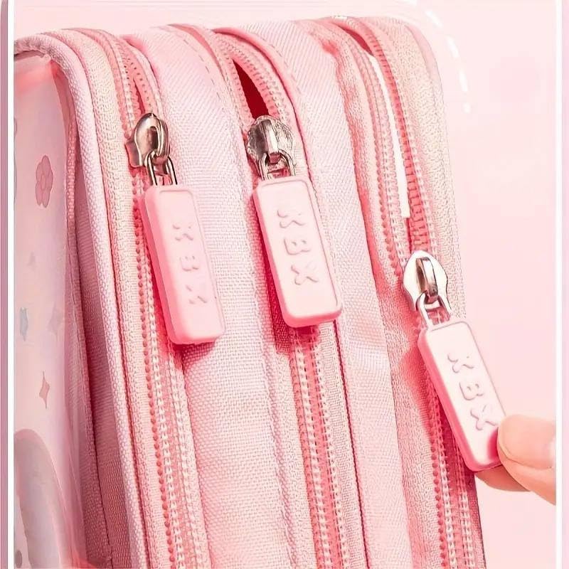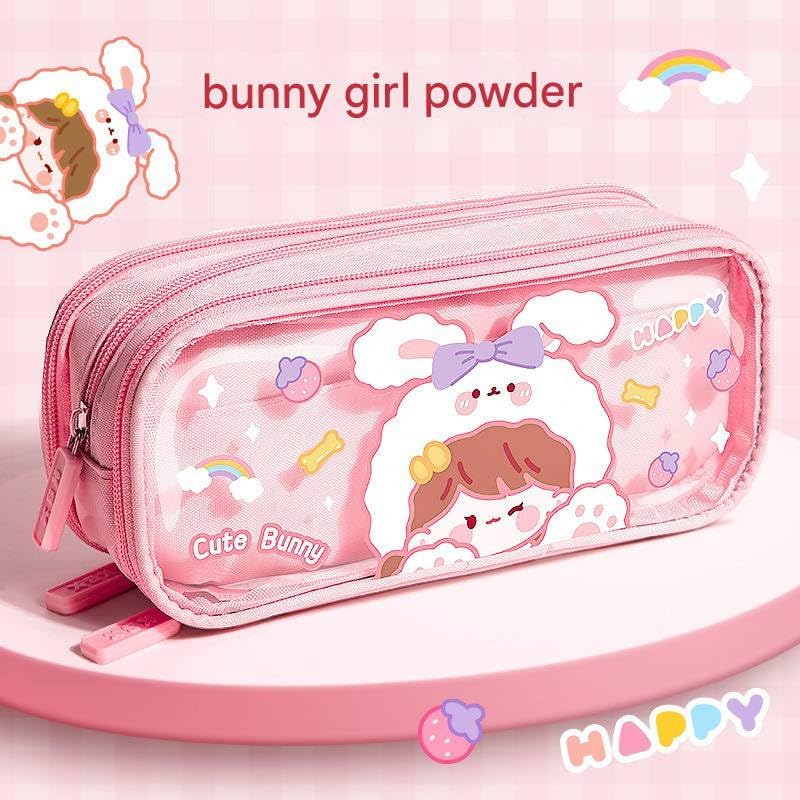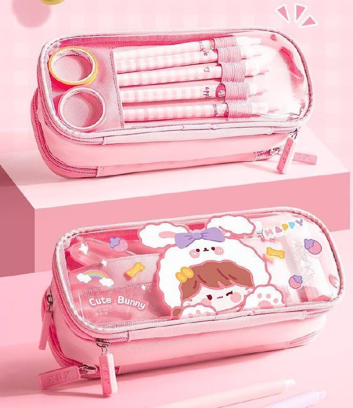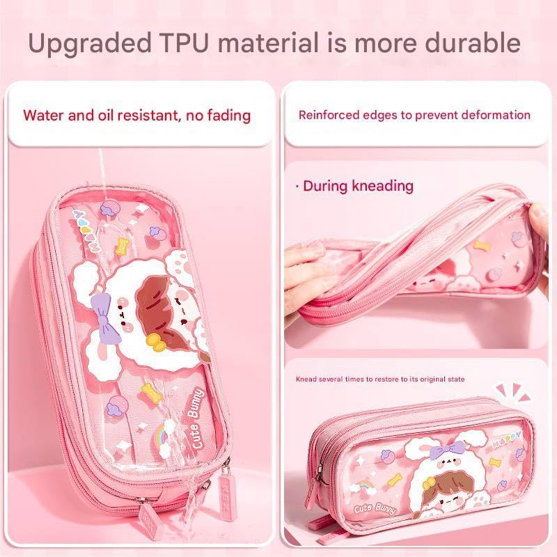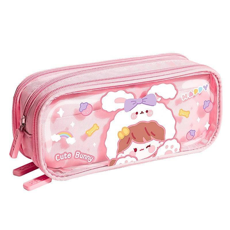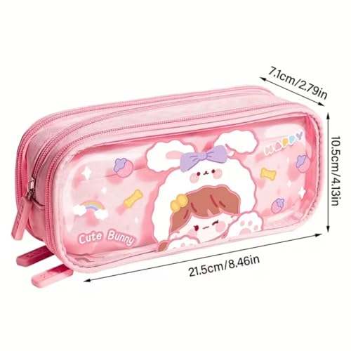 Generic - مقلمة أقلام رصاص شفافة من القماش بسعة كبيرة وطباعة كرتونية لطيفة مع ثلاث أقسام لتنظيم الأدوات المكتبية، متعددة الوظائف بتصميم سوستة متينة (نمط أرنب لطيف)