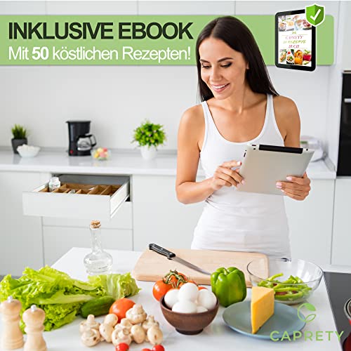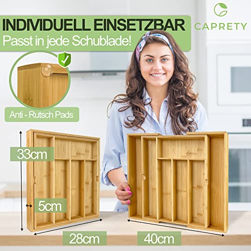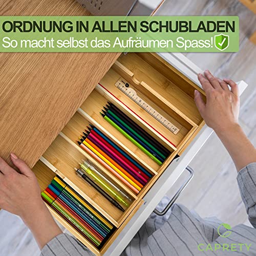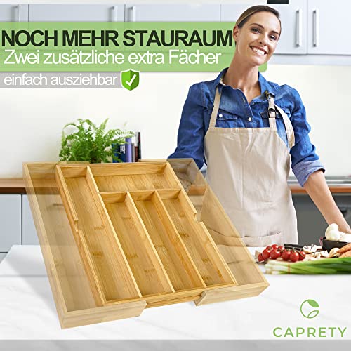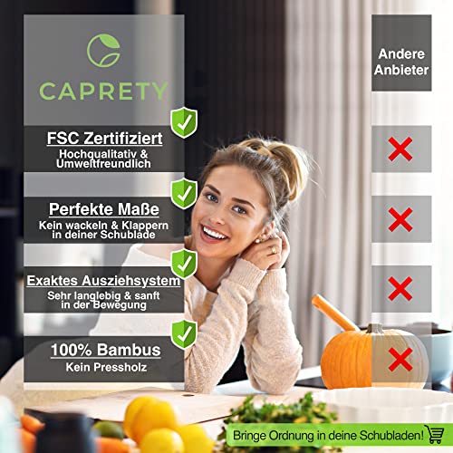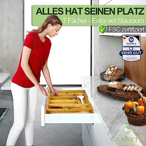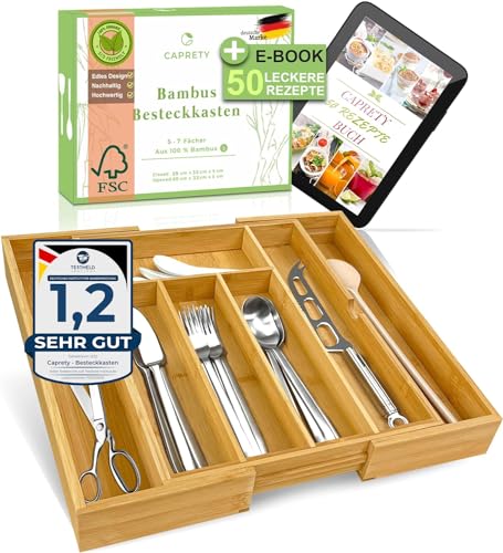 CAPRETY - صينية ادوات مائدة من الخيزران للادراج كابريتي® مع 50 وصفة كتاب الكتروني - معتمدة مجلس رعاية الغابات - 7 مساحات تخزين قابلة للتعديل - حشوة خشبية للتمدد مقاس S