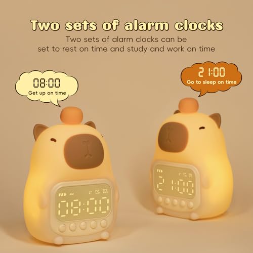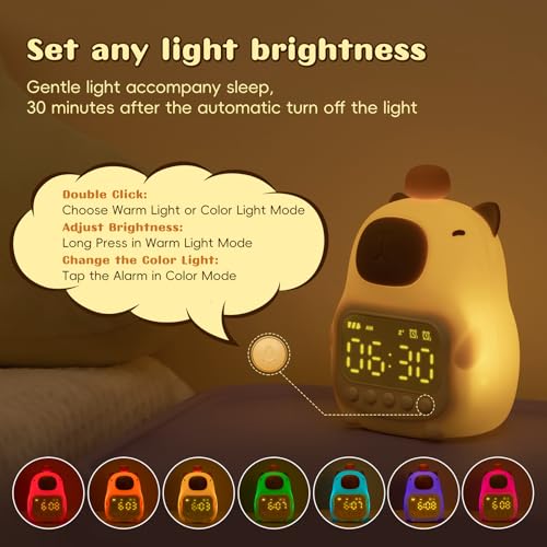 Yiliaw - ساعة منبه من كابيبارا مع ضوء ليلي للاطفال، 7 الوان RGB، ساعات منبه لطيفة لغرف النوم، ساعات موافق للاستيقاظ، مصباح سطح الطاولة من السيليكون للبنات والاولاد المراهقين