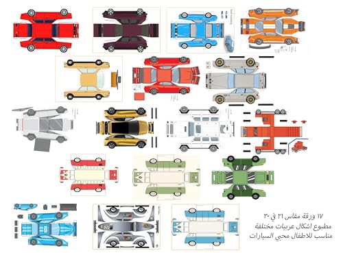 - محتوى المجموعة: 17 ورقة مقاس 21 في 30 سم تحتوي على نماذج سيارات متنوعة قابلة للقص واللصق لإنشاء مجسمات ثلاثية الأبعاد