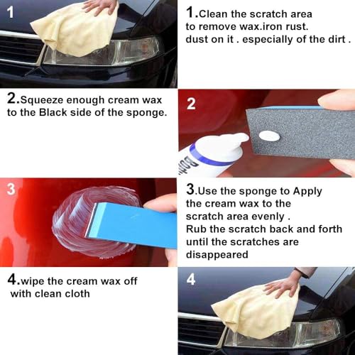 - إصلاح سهل وسريع -- فقط قم بتنظيف منطقة الخدوش وإزالة الأوساخ والشمع والصدأ الحديدي. اضغطي كمية كافية من الكريم للإسفنجة. استخدمي الإسفنجة افرك الخدش حتى تختفي الخدوش. ثم امسح شمع الكريم. (للحصول على خطوات محددة، يرجى التحقق من التعليمات.) ستوفر لك هذه التقنية الكثير من الوقت والمال وتحافظ على سيارتك لامعة ونظيفة.