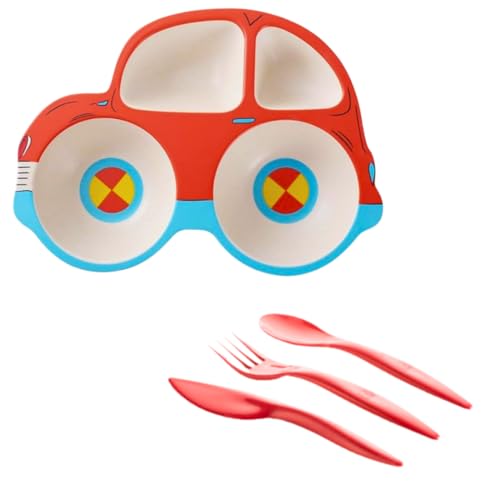 Generic - أدوات مائدة أطباق طعام عميقة من ألياف البامبو بشكل سيارة بألوان عشوائية خالية من بيسفينول أ، طقم عشاء 4 قطع مع ملعقة بلاستيكية وشوكة وسكين وطبق للإطعام والأماكن الخارجية صديقة للبيئة، أحمر وأزرق فاتح