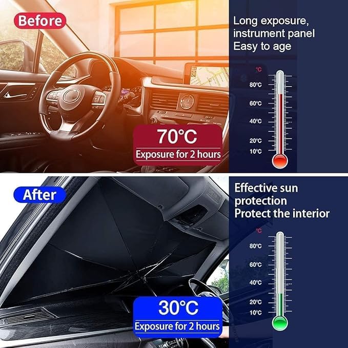 - حماية فعالة من أشعة الشمس: مصنوعة من مواد مقاومة للحرارة وصديقة للبيئة، تحجب مظلة الشمس الخاصة بنا أشعة الشمس المباشرة، وتقلل من درجات حرارة السيارة وتمنع تلف السيارة. تنفس الهواء النقي داخل سيارتك!