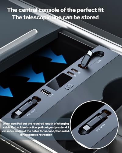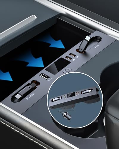 ibxShow - شاحن سيارة USB متعدد المنافذ لسيارة تسلا موديل 3 هايلاند موديل 2024 2025 والموديل الجديد واي جونيبر 2026، ملحقات تسلا متعددة الوظائف مع شعار وكابل قابل للسحب، موزع USB تسلا، هدايا لمالكي تسلا