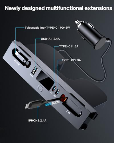 - 【ترقية تأتي مع كيبل قابل للسحب】5 منافذ مع كابل قابل للسحب بطول 3.9 قدم (120 سم) لشحن المقعد الخلفي للسيارة. مصمم لشحن العائلة والمجموعات الكبيرة في نفس الوقت، قم بتشغيل جميع الأجهزة في سيارتك في وقت واحد.