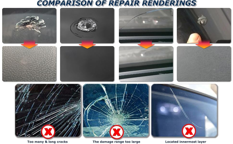 - الاستخدام الواسع - تم تصميم مجموعة أدوات إصلاح الزجاج الأمامي لمعظم أنواع الزجاج الخارجي الصغيرة التي تضررت بفعل زجاج أمامي مصفح بطبقتين. يمكن أن يصلح بشكل فعال الرقائق الصغيرة، عين الثيران، شبكة العنكبوت، الهلال على شكل نجمة، نصف القمر، لا يزيد عن 12 بوصة / 30 سم والأضرار المستديرة التي لا يزيد قطرها عن بوصة واحدة. (إرشادات: لا يعمل مع شاشة الموبايل.)