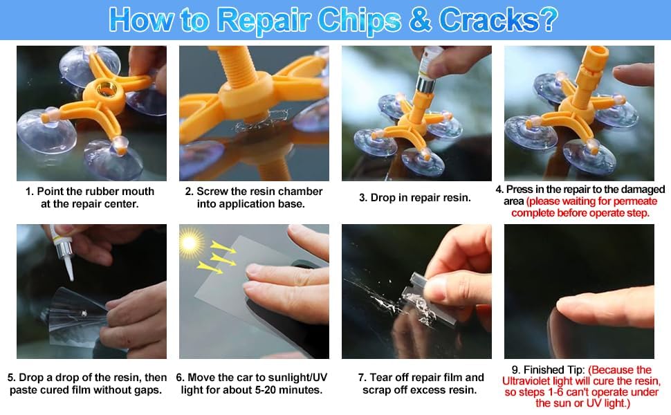 - سهلة التشغيل - مجموعة أدوات إصلاح الزجاج الأمامي سهلة الاستخدام، أولاً، قم بتنظيف وتجفيف سطح الزجاج الأمامي ثم ضغط الراتينج في الأجزاء. ثم ضع الغشاء المعالج، ثم جففه بسرعة ويتصلب تحت الضوء فوق البنفسجي لمدة 5-10 دقائق. إنه لكشط الراتنجات المتبقية باستخدام الملعقة.