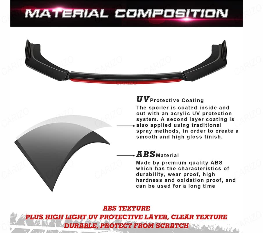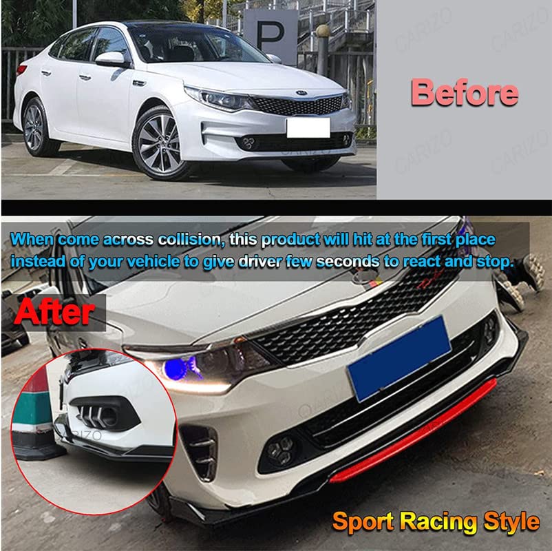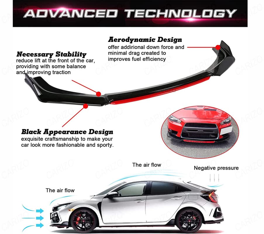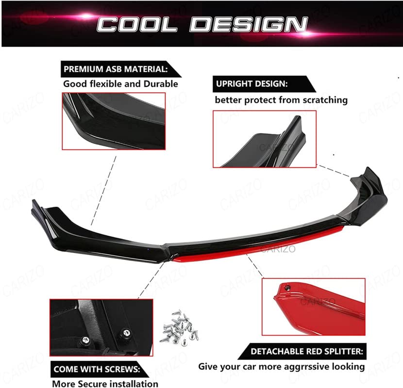 CARIZO - طقم كساحة اكصدام أمامي للسيارة بتوافق عالمي من كاريزو (4 قطع، أسود لامع مع تصميم بلون أحمر)، اكصدام أمامي للجناح الخلفي متوافق مع ماهيندرا فيريتو