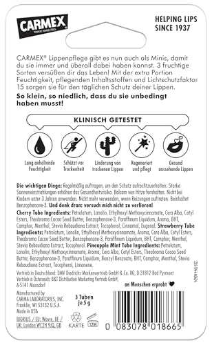 Carmex - مرطب شفاه مينيس للعناية بالشفاه الجافة والمتقشرة، مرطب شفاه مع الفازلين وفيتامين اي وشمع العسل والحماية من الشمس، مرطب مكثف في شكل صغير عملي من كارمكس (3 × 5 جم)