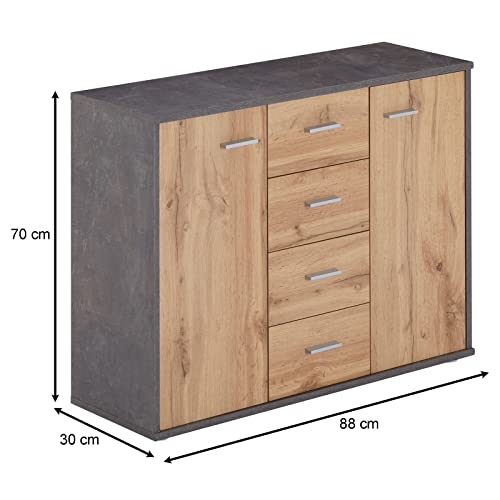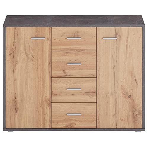 CARO-Möbel - خزانة جانبية جامي ببابين وأربعة أدراج، خزانة أدراج من أثاث المكتب بلون الخرسانة الداكن/لون خشب بلوط الووتان من كارو موبيل