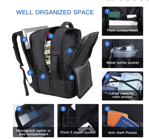 HZENPPOR - شنطة ظهر للسفر كبيرة بسعة 50 لتر مرنة بحجم 45 سم، شنطة ظهر سوداء مضادة للماء معتمدة من شركات الطيران، شنطة للرجال والنساء تتسع لجهاز حاسوب محمول (لاب توب) مقاس 17 بوصة و17.3 بوصة