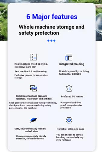 - قماش عالي الجودة من البولي يوريثان وليكرا ثنائي الطبقات: صُنعت الشنطة من قماش من جلد صناعي عالي الجودة، وهي متينة ومقاومة للتآكل وناعمة الملمس. وتتميز بدعامة داخلية من ليكرا مزدوجة الطبقات، وقالب دقيق الفتحات ومقاومة للصدمات والسقوط والخدوش. توفر شنطة الحماية هذه مقاومة للاصطدامات وحماية من الخدوش. مما يضمن حماية طائرتك دي جي اي نيو بدون طيار أثناء النقل أو السفر.