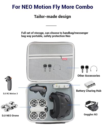 - سعة تخزين كبيرة: يمكن لهذه الشنطة تخزين طائرة دي جيه اي نيو درون ونظارات دي جيه اي N3 ودي جيه اي ار سي موشن 3 وموزع شحن البطارية و4 بطاريات (بما في ذلك البطارية الداخلية للطائرة). يمكن للجيب الشبكي المزود بسوستة حمل الاكسسوارات الأخرى مثل فلاتر العدسات والمراوح الاحتياطية والمفكات وكابلات الشحن وما إلى ذلك.