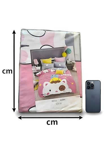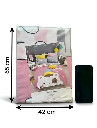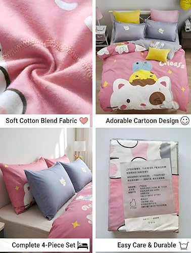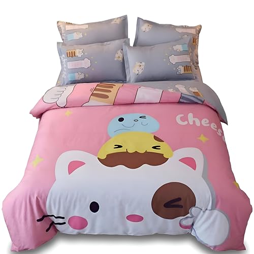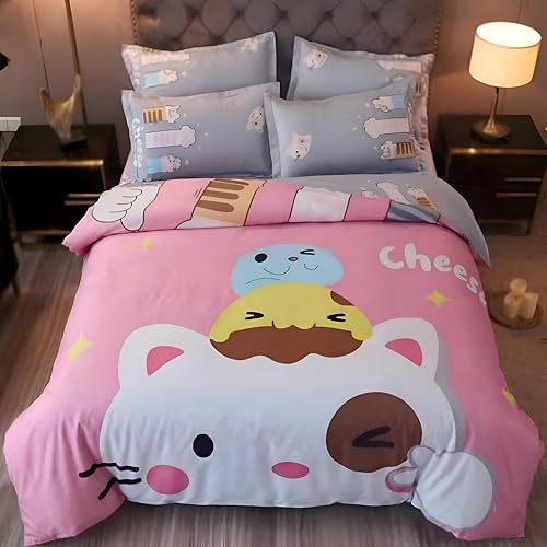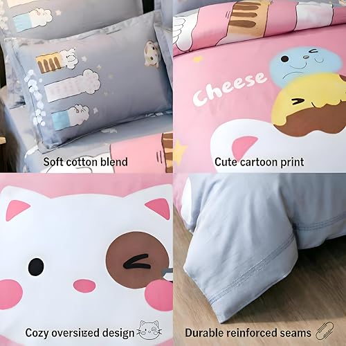 - يتميز غطاء اللحاف البينك النابض بالحياة بقطة كرتونية ساحرة محاطة بالحلويات المكدسة وكلمة "تشيز" المرحة، بينما تعرض أغطية الوسائد الرمادية المتناسقة أنماطًا تكميلية بطابع الطعام، مما يخلق جمالية مبهجة ومبهجة تحول أي غرفة نوم إلى ملاذ سحري.