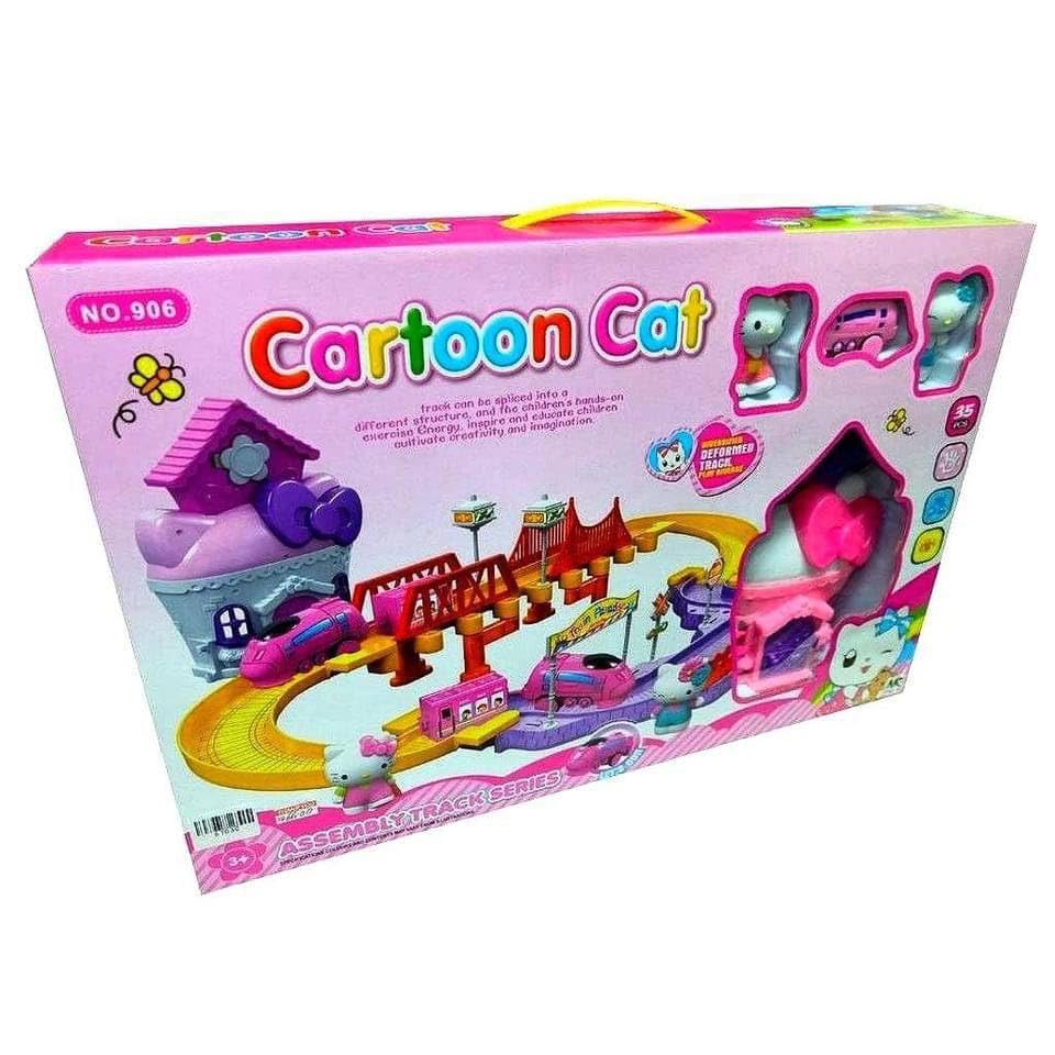 Generic - لعبة قطار القط الكرتوني بمسار تجميع يحتوي على جسور ومنازل، مناسبة للأطفال من عمر 3 سنوات فأكثر، وردي