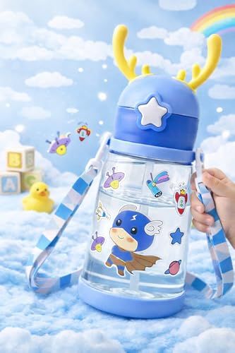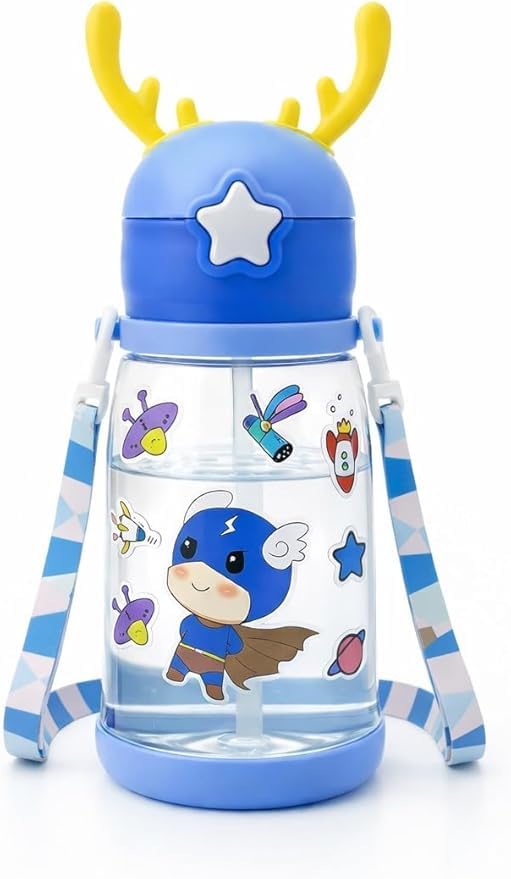 Generic - زجاجة مياه بتصميم كرتوني مع تفاصيل سيليكون، زجاجة بلاستيكية قابلة لاعادة الاستخدام مانعة للتسرب وخالية من BPA مع حزام كتف، زجاجة شرب سهلة التنظيف 600 مل (ازرق)