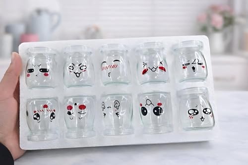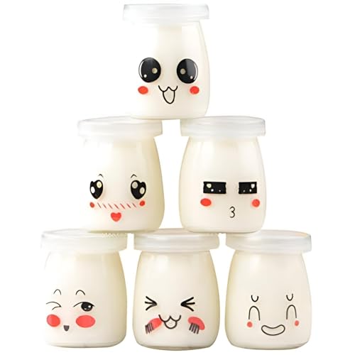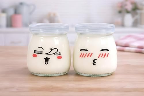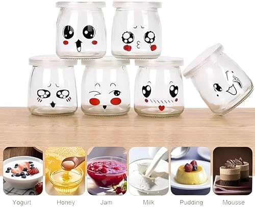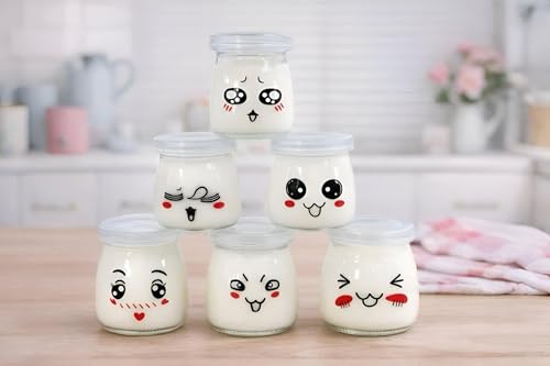 Generic - برطمان زبادي كرتوني؛ برطمان زجاج لطيف بوجه كرتوني وغطاء سيليكون، إغلاق محكم للزبادي، والحلويات، والبودينج، والمربى وغيرها؛ قابل لإعادة الاستخدام، وآمن للاستخدام في الميكروويف وغسالة الأطباق