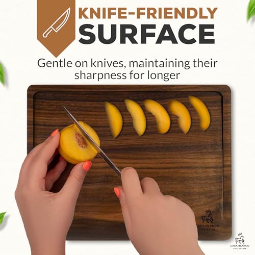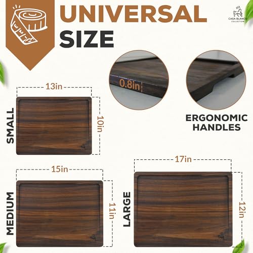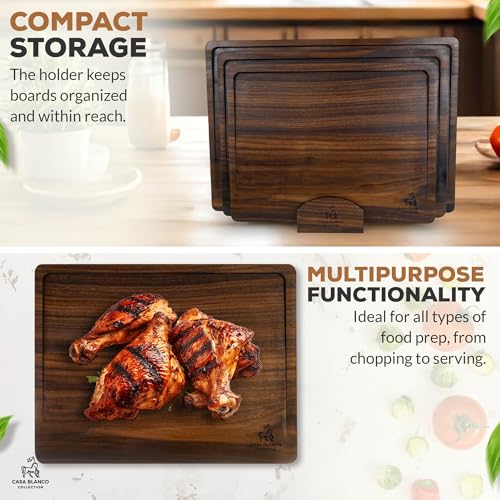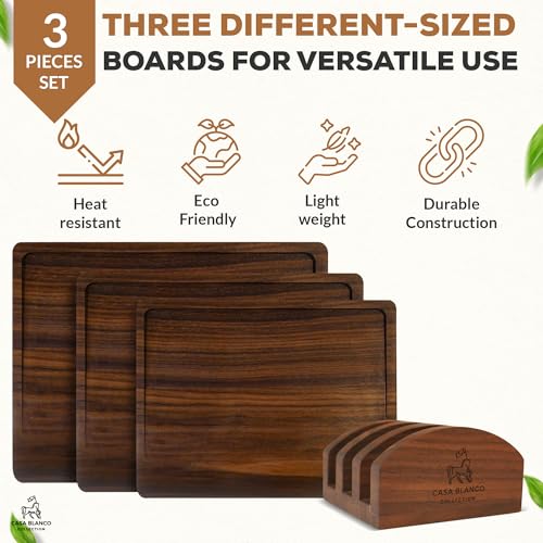Casa Blanco Collection - مجموعة الواح تقطيع من كازا بلانكو مكونة من 3 قطع من خشب الجوز الاسود مع حامل - ادوات طبخ فاخرة للمطبخ، مجموعة مكعبات تقطيع خشبية للحوم والفواكه والخضروات، مقاسات متنوعة، مقابض سهلة الامساك