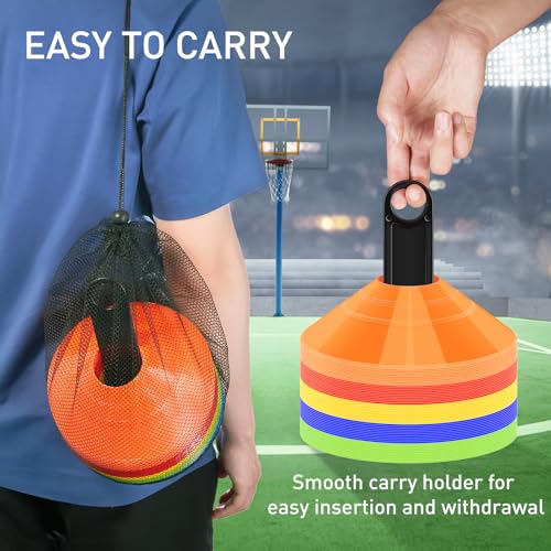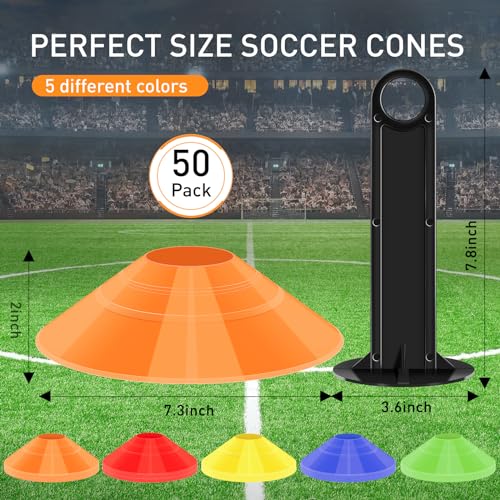 - 【50 عبوة من مخاريط كرة القدم عالية الجودة】هناك 50 مخروط تدريب كرة القدم في 5 ألوان (10 من كل لون)، 1 حقيبة حمل وقطعة واحدة من حامل مخروطي مع حقيبة شبكية متينة برباط للحفاظ على المخاريط القرصية منظمة لسهولة التخزين والحمل. إنها أداة ضرورية للتدريب على المرونة. مثالية لأنواع التدريب الرياضي.