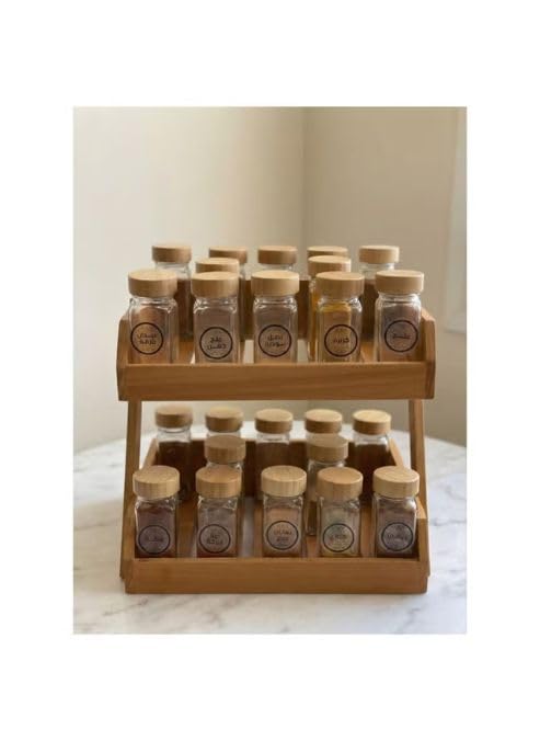 generic - رف توابل خشبي فاخر بطبقتين مع 24 برطمان زجاجي من كاسا هوم - لمسة نهائية من الخشب الطبيعي - ملصق عربي - منظم مطبخ أنيق