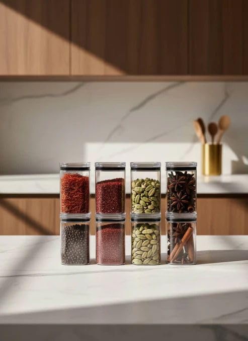 generic - حاويات توابل معيارية قابلة للتكديس من كاسا هوم، برطمانات بلاستيكية شفافة مع اغطية جرافيت محكمة الغلق لتنظيم المؤن وسطح الطاولة - شفاف كريستالي ورمادي