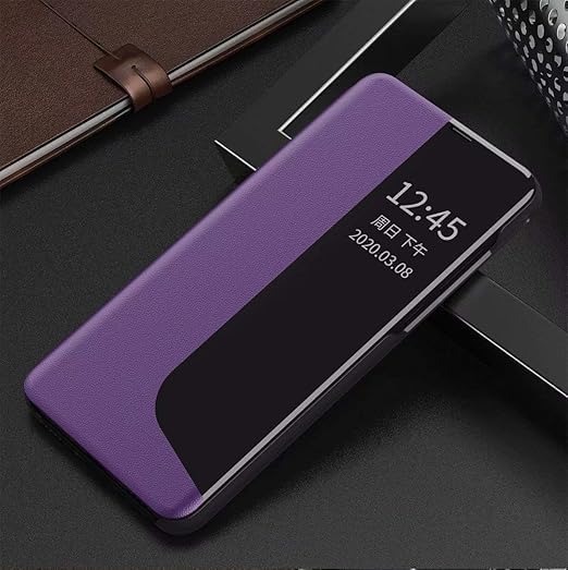 ELMO3EZZ - حافظة متوافقة مع موبايل ريلمي C65، حافظة من جلد البولي يوريثين الفاخر قابلة للطي مع نافذة لعرض الاعمال، غطاء جوال واقي غير اصلي (ارجواني)