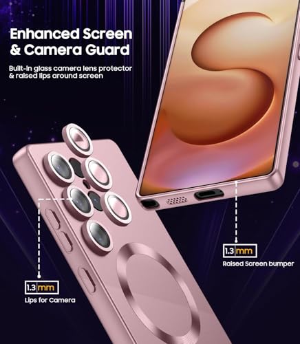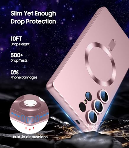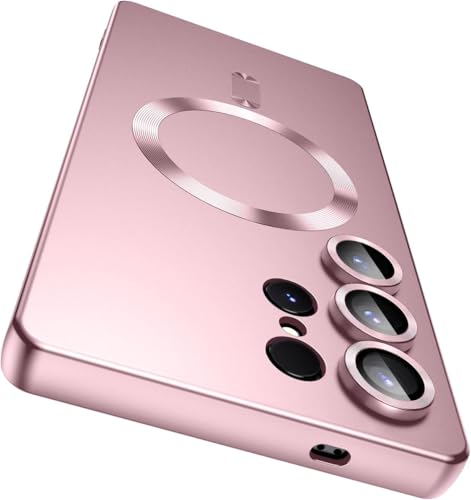ELMO3EZZ - جراب حماية مغناطيسي رفيع من السيليكون الناعم ممتص للصدمات مع واقي عدسة كاميرا ببريق ميتاليك مدمج متوافق مع ماج سيف لموبايل سامسونج جالاكسي S22 الترا (روز جولد)