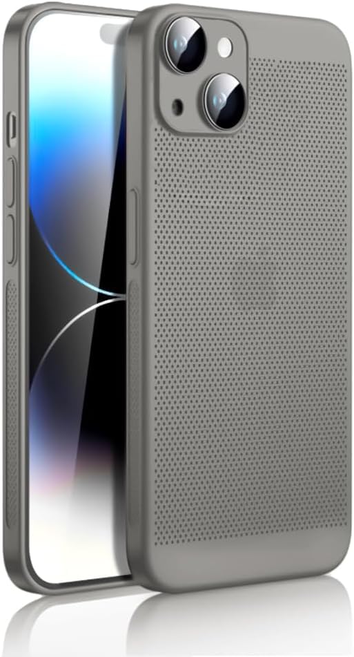 ELMO3EZZ - جراب بتصميم لتبديد الحرارة وحماية مدمجة لعدسة الكاميرا رفيع ومريح لليد بمسامات للتهوية ومقاومة للبصمات مصنوع من البولي كربونات الصلب لحماية فائقة من الصدمات متوافق مع آيفون 15 بلس 6.7 بوصة (رمادي)
