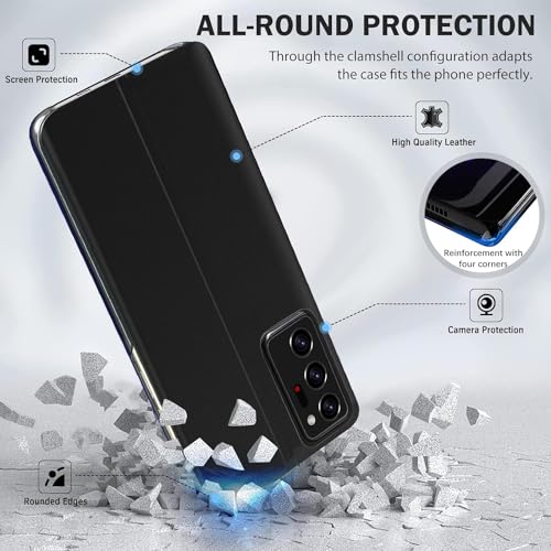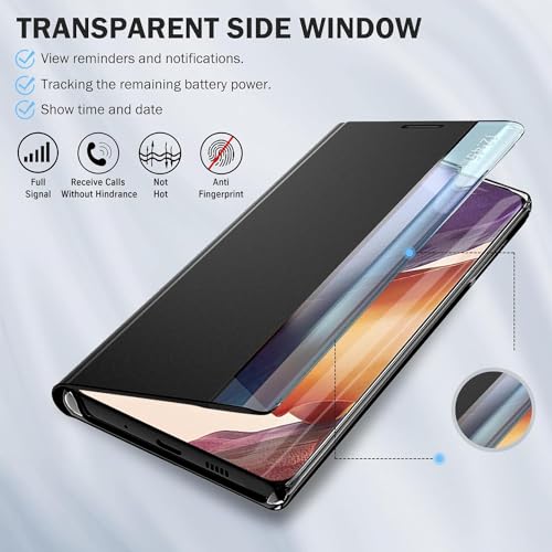 Case GangTing - جراب حماية رفيع وفاخر قابل للطي من البولي كربونات مع نافذة شفافة ومرآة صلبة ومسند لموبايل سامسونج جالاكسي نوت 20 الترا، أسود