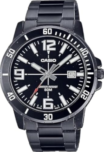 Casio - ساعة رياضية كاجوال انتايسر بعرض انالوج بعقارب ومينا اسود وهيكل من الستانلس ستيل مقاوم للماء والغبار للرجال كاسيو لون - MTP-VD01B-1BV أسود