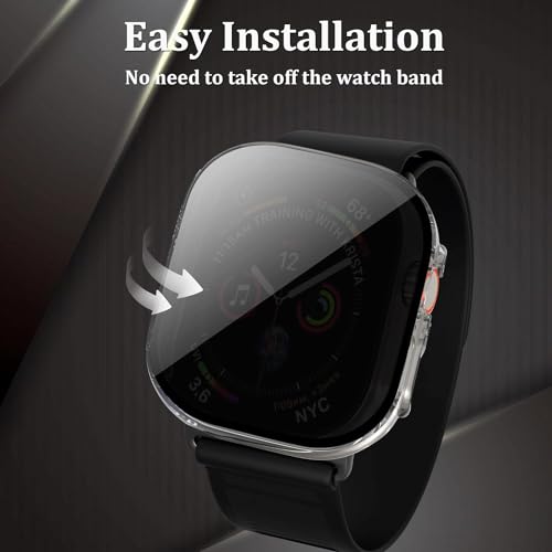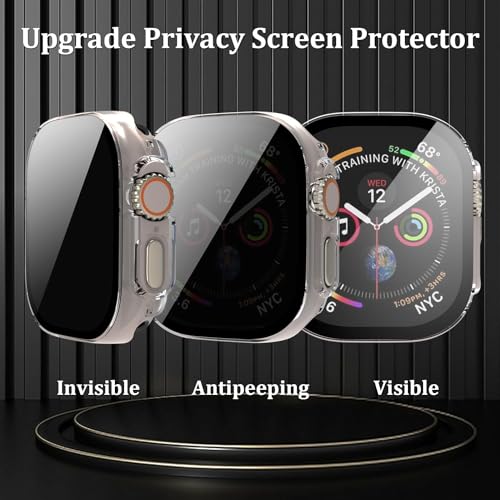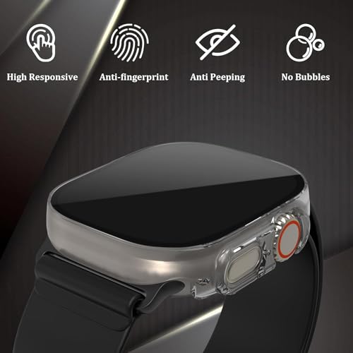 - [شاشة حماية مضادة للتجسس]: الشاشة واضحة فقط للأشخاص الموجودين أمام الشاشة مباشرة، ولا يمكن رؤية شاشة الساعة الذكية إذا كانت من زاوية أقل من 30 درجة. شاشة حماية بتصميم مطور من الزجاج المقوى وحافظة واحدة لساعة آبل 49 ملم.
