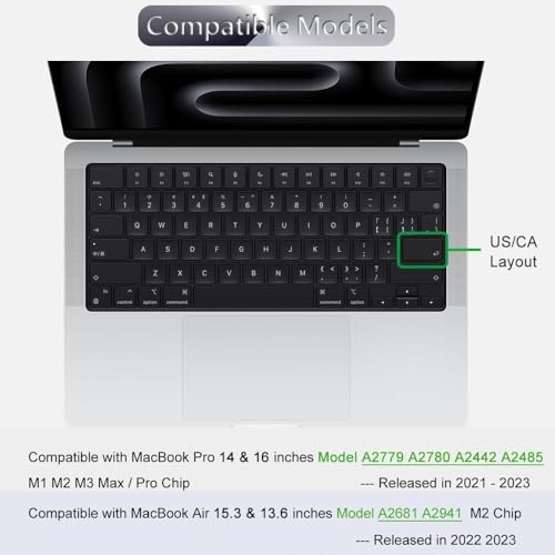 - يناسب بدقة جهاز ماك بوك اير 15 بوصة 2024 2023 شريحة M2 (الموديل: A2941)، 2022 2023 ماك بوك اير 13.6 بوصة شريحة M2 (الموديل: A2681) ومتوافق مع ماك بوك برو 14 بوصة رقاقة M3 M2 M1 برو/ماكس، إصدار 2023 2022 2021 (الموديل: A2918 / A2992 / A2779 / A2442) ومتوافق مع ماك بوك برو 16 بوصة M2 M1 برو/ماكس إصدار 2023 2022 2021 (الموديل: A2991 / A2780 / A2485).