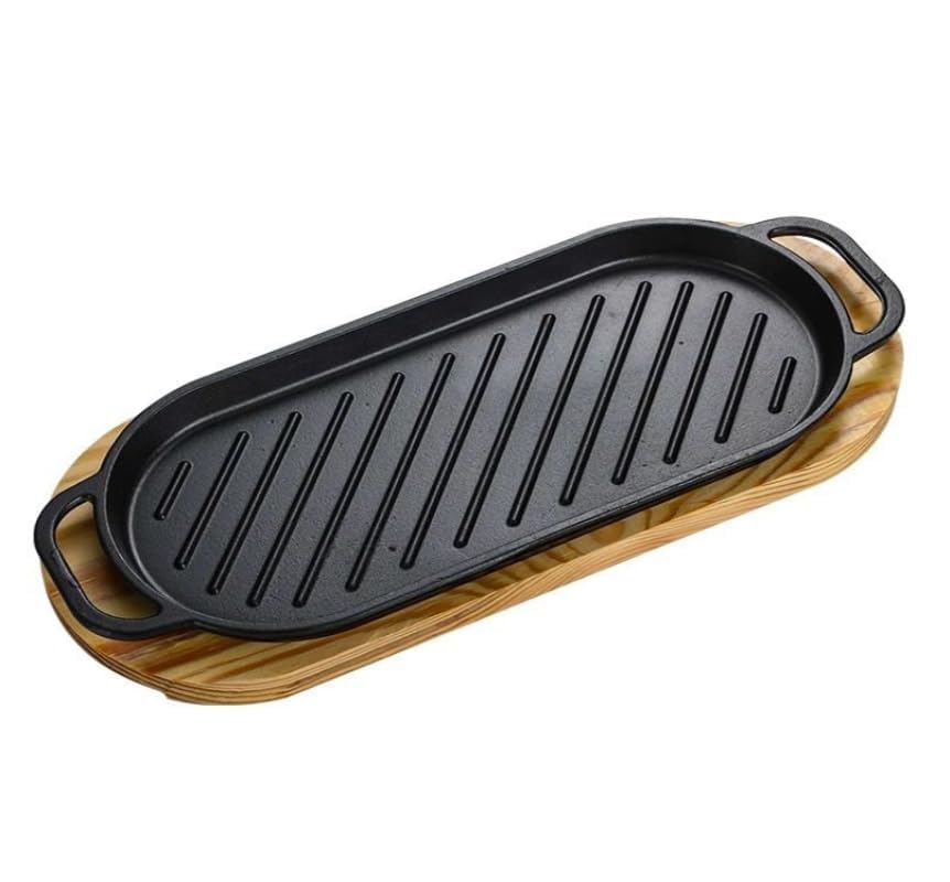 Generic - صينية شواء من الحديد الزهر، مقلاة فاهيتا ستيك يابانية، صينية ستيك بقاعدة خشبية للمطعم والمنزل، ملحق طبخ لشواء اللحوم والمأكولات البحرية (بيضاوي)