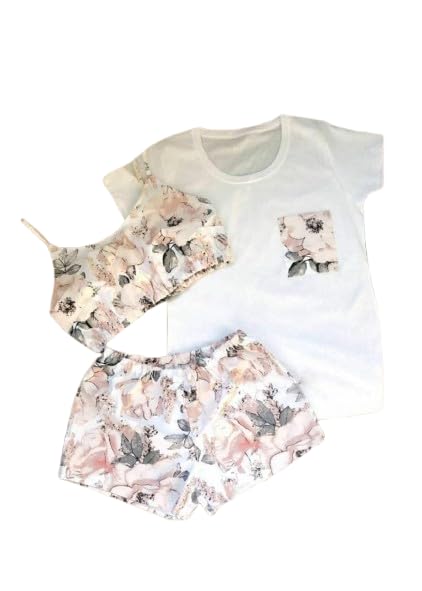 Generic - بيجامة صيفي كاجوال شورت 3 قطع للنساء مقاس موحد قطن ليكرا كود 1006 لون ابيض