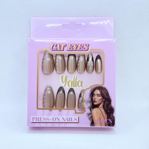 Generic - مجموعة أظافر اصطناعية متوسطة الطول تثبت بالضغط بتأثير عين قطة جميل مع لمسة نهائية جل لصالونات التجميل بتصميم ثعبان وشكل لوز ومكونة من 12 قطعة، بني