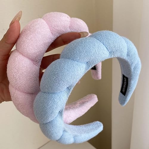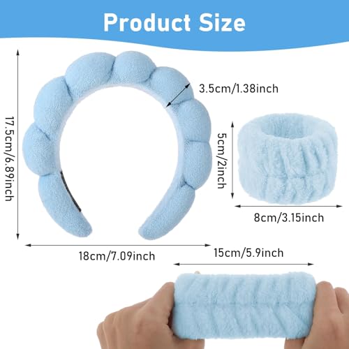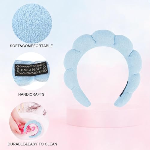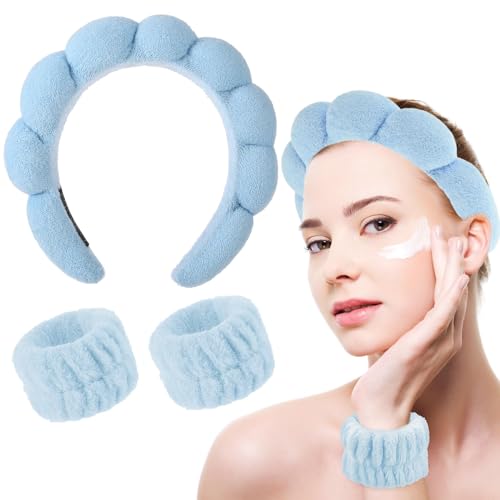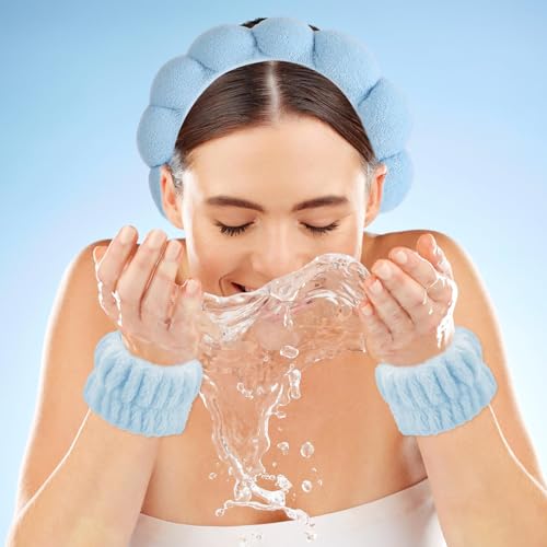 CCHELIZI - شريط راس سبا من تشيليزي لغسل الوجه والمكياج والعناية بالبشرة مع اساور معصم لغسل الوجه، شريط راس من قماش تيري ناعم ومنتفخ مناسب كهدية للنساء (ازرق، مقاس واحد)