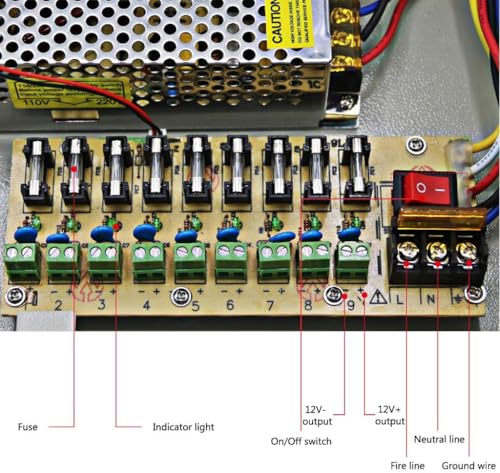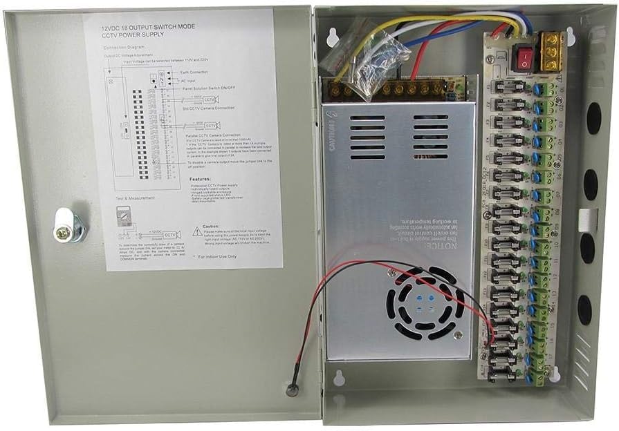 - مزود طاقة كاميرات المراقبة باور سبلاي بتوزيع الطاقة على 9 قنوات، سي سي تي في بمخرج 12 فولت وتيار 10 أمبير، مناسب لأنظمة مراقبة التلفزيون الرقمي (DVR) وأنظمة الأمان والكاميرات