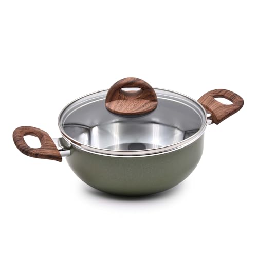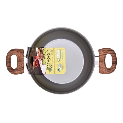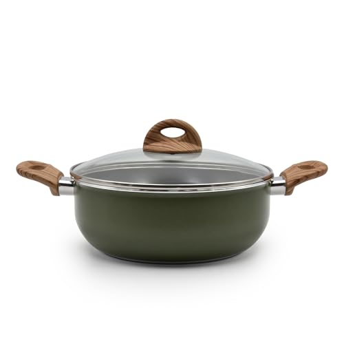 CELAR - قدر طبخ من سيلار، مصنوع من الألومنيوم، لون أخضر، بطلاء غير لاصق، مع غطاء زجاجي ومقبض خشبي ناعم الملمس. يتميز بسطح داخلي مضاد للالتصاق ومتوافق مع الطبخ بالحث