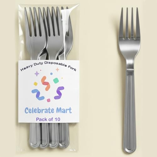 Celebrate Mart - شوك بلاستيكية شديدة التحمل للاستعمال مرة واحدة من سيليبريت مارت - ادوات مائدة متينة للاستخدام مرة واحدة للحفلات وتقديم الطعام والمناسبات وتقديم الطعام اليومي (10، فضي)
