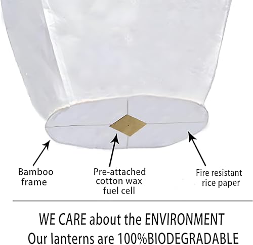 - تم تصميم كل فانوس مع وضع السلامة في الاعتبار، ويحتوي على خلية وقود من الشمع القطني المرفقة مسبقًا، مما يسمح بسهولة الإشعال والتحرير الآمن في السماء، وهو مثالي لخلق لحظات سحرية دون متاعب.
