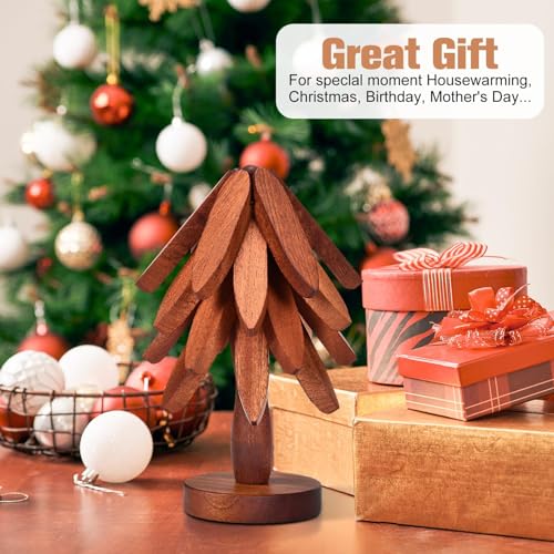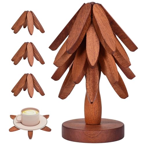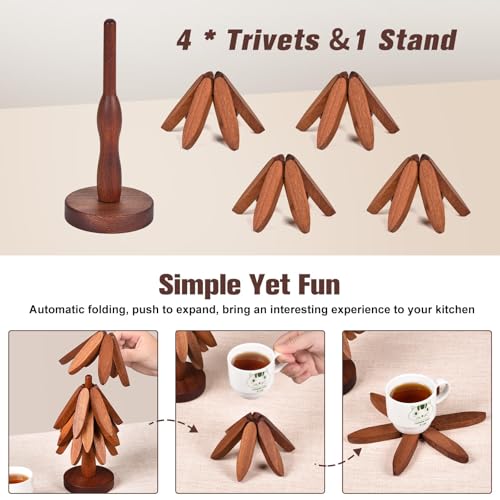 CENXI - حامل خشبي للاطباق الساخنة من سينكسي، مجموعة حوامل على شكل شجرة، 4 حوامل خشبية + 1 حامل، حامل للاطباق الساخنة، حامل خشبي طبيعي قابل للطي، للاطباق الساخنة والوعاء والقوس وابريق الشاي (خشب الجوز الاسود)