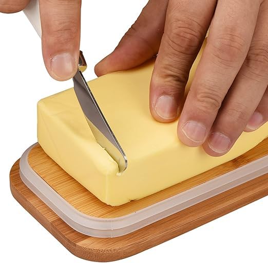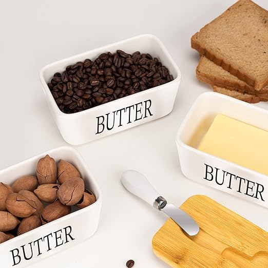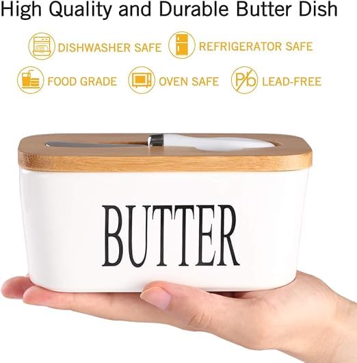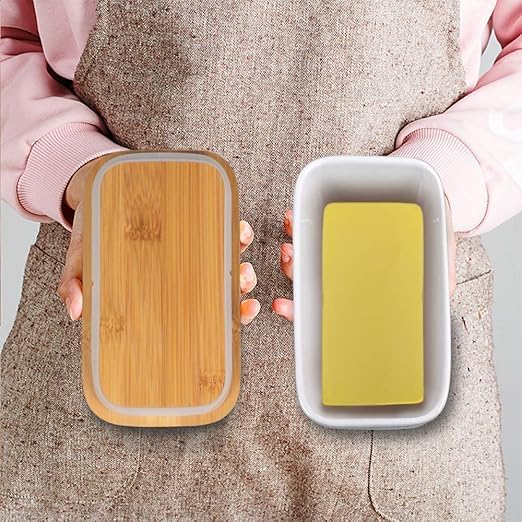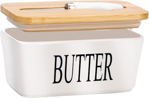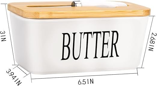 - تعد علبة الزبدة ذو التصميم اللطيف هذا هدية فريدة للأصدقاء والعائلة. سيحبون علبة الزبدة ذات التصميم اللطيف هذا لإضافة لمسة من الأناقة إلى أسطح المطابخ والطاولات. المزايا: غطاء متين من الخيزران مع حلقة للإغلاق المحكم والحفاظ على الزبدة طازجة. يتضمن سكين لتوزيع الزبدة بسهولة. مصنوع من بورسلين عالي الجودة ويدوم طويلًا. يتميز بتصميم عميق وعريض ويوفر مساحة تخزين كبيرة لتخزين المزيد من قطع زبدة.