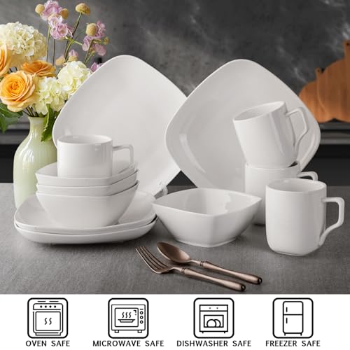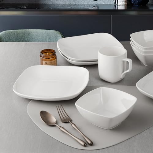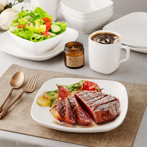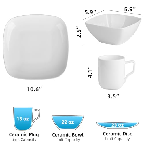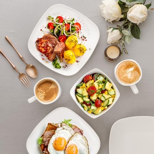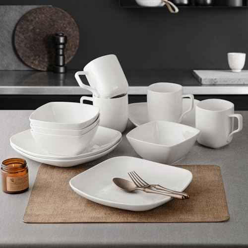 KITCHENLESTAR - طقم ادوات مائدة من السيراميك، طقم اطباق واوعية من السيراميك، طقم مربع مع اكواب خدمة لـ 4 اشخاص، اطباق سلطة العشاء والحلوى وبولات الحبوب، ابيض (12 قطعة)