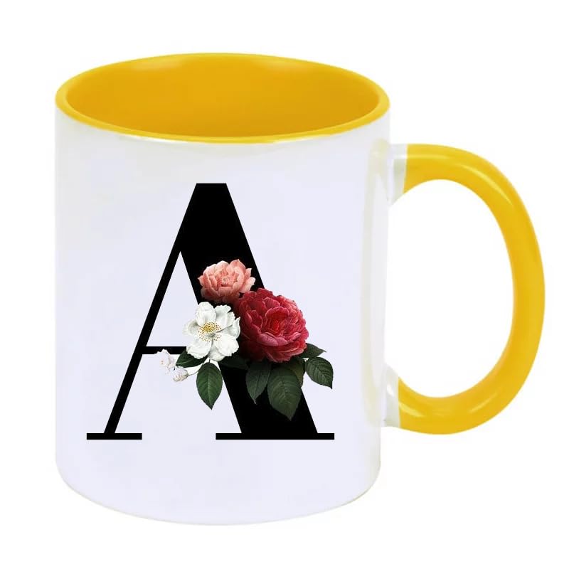 Generic - مج سيراميك - كوب شفاف كلاسيكي وانيق مزين بحروف ابجدية مزين بالزهور - اصفر