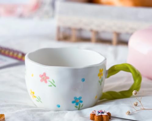 Generic - مج سيراميك بتصميم زهور ومقبض اخضر، سعة 400 مل، ابيض مع زهور ملونة