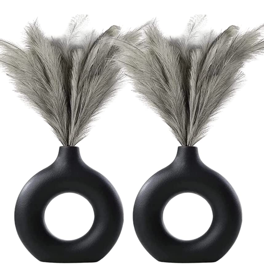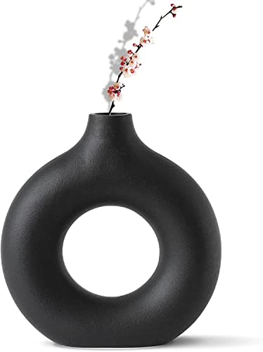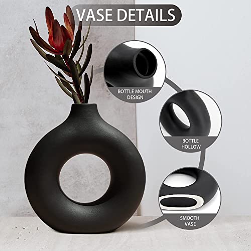 Ceramic Shop - فازة حلقية سوداء من ذا سيراميك شوب | فازة زهور | فازة عشب البامباس | فازة سيراميك | فازة دائرية الشكل | قطعة مركزية لديكور المنزل | فازة بتصميم دونات - (مجموعة من قطعتين) مقاس 20 و20 سم
